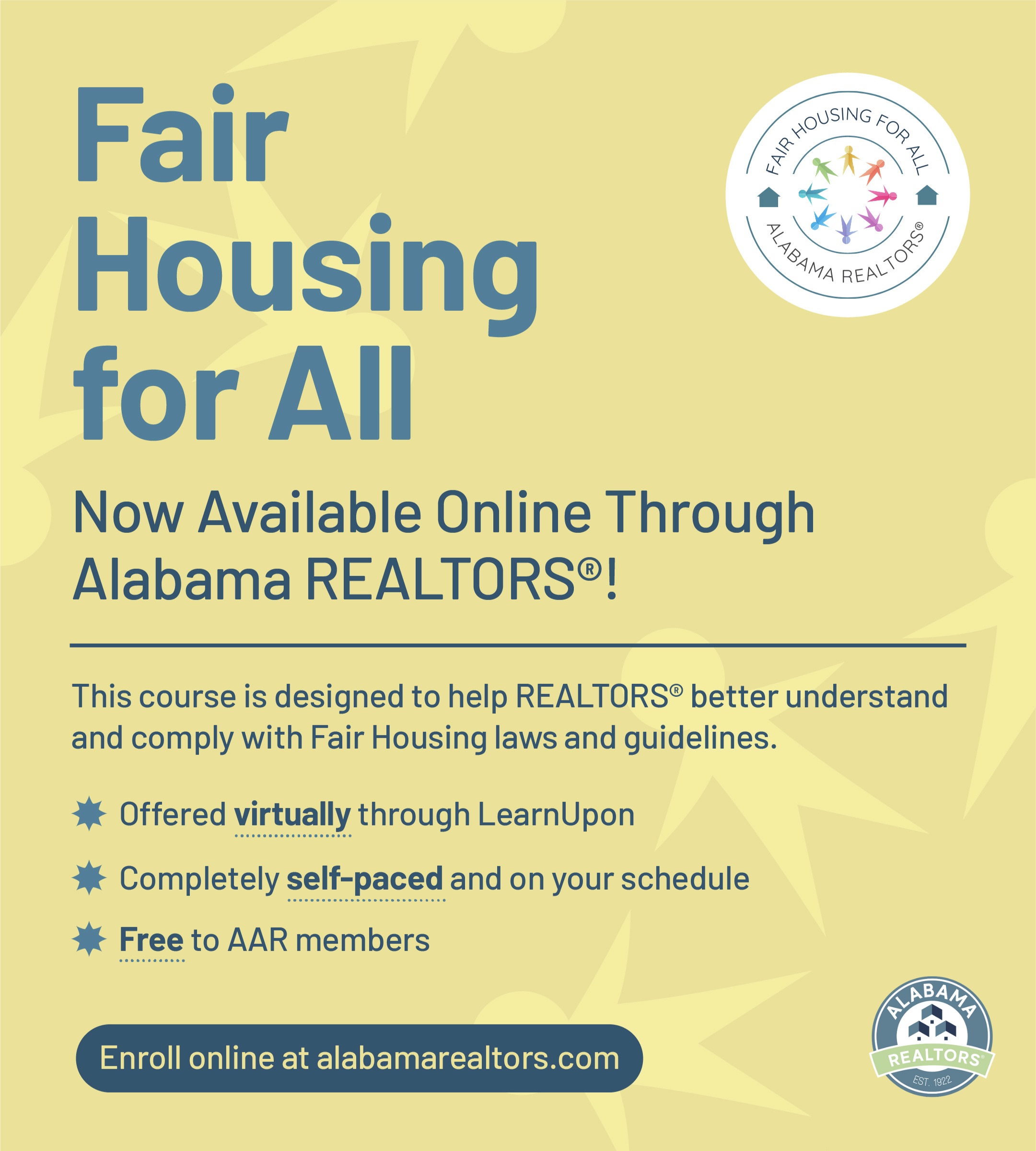 [LOCAL BOARD NAME] members can now access a free, self-paced Fair Housing for All course online through Alabama REALTORS®! 🏡 The course is easy to enroll in, flexible to complete on your schedule, and satisfies NAR fair housing requirements. Enroll today at https://alrealtors.co/fhfa to start learning! - FYI: Sharing the FHFA graphic satisfies Core Standards compliance.